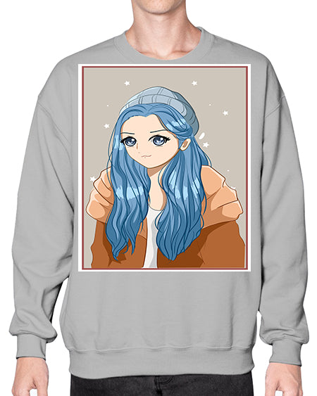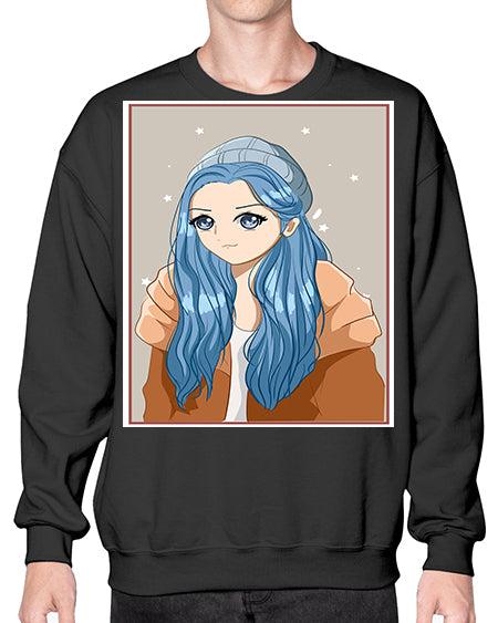 Cute and beautiful girl long blue hair in the winter 142# - anime- Sweatshirt - Crew