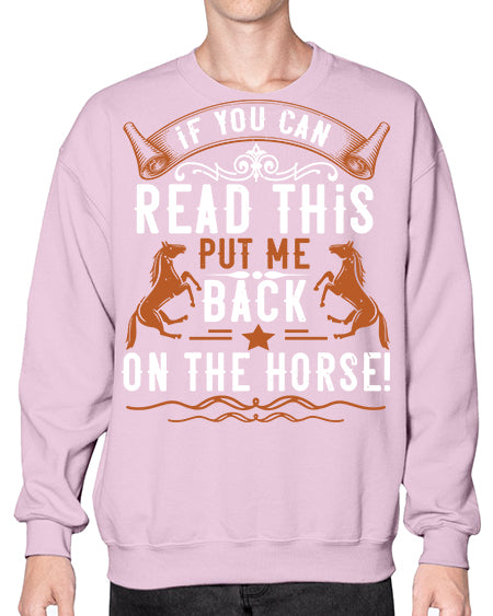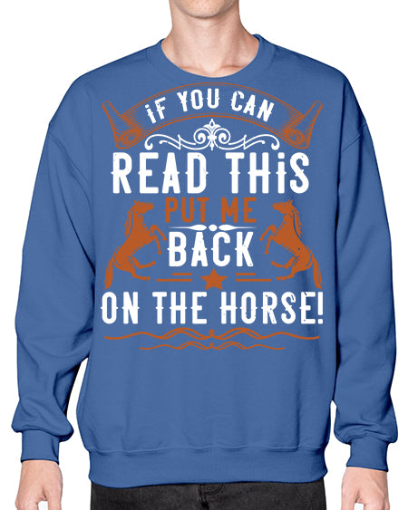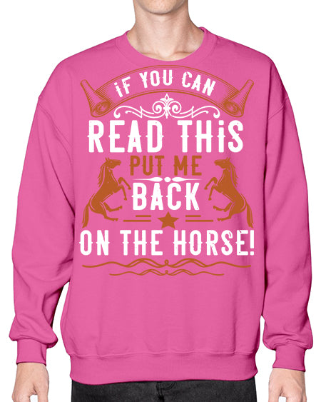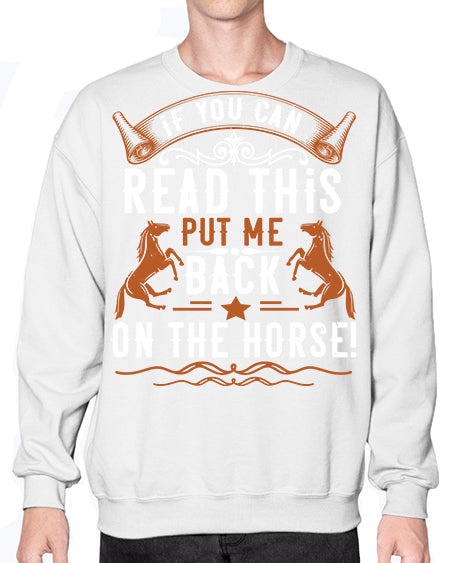 if you can read this put me back on the horse Style 37# - horse - Crew Note: There is a 2 - 4 day creation time, which may delay shipping. Details- Preshrunk fleece knit