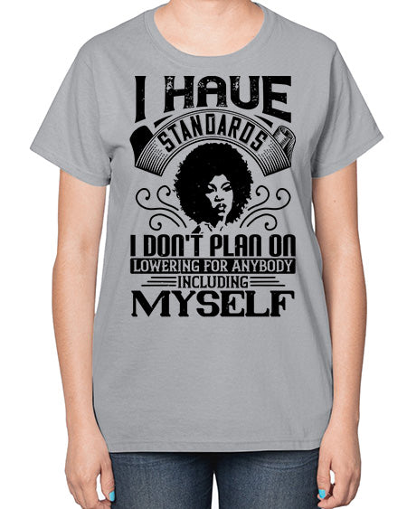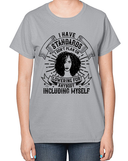 I have standards I dont plan on lowering for anybody … including myself Style 4# - black afro- Ladies T-Shirt