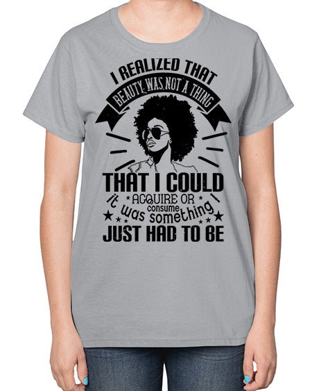 I realized that beauty was not a thing that I could acquire or consume Style 26# - black afro- Ladies T-Shirt