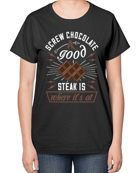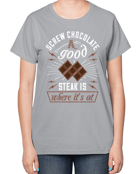 screw chocolate a good steak is where its at 384# - chocolate- Ladies T-Shirt