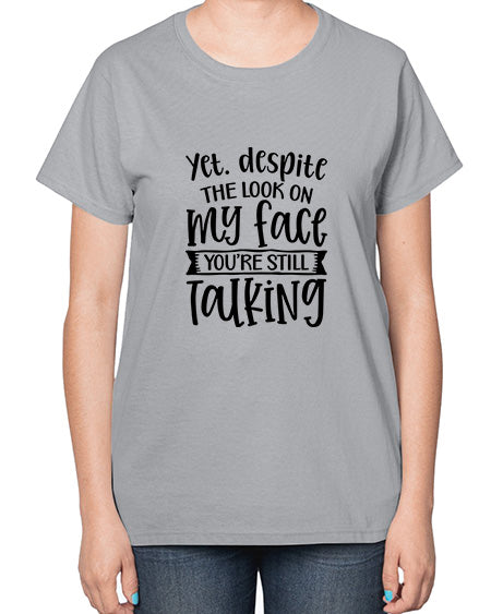 Yet despite the look on my face youre still talking 1263# - funny- Ladies T-Shirt