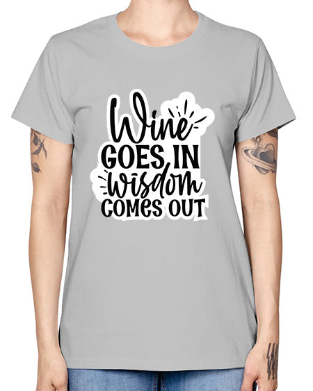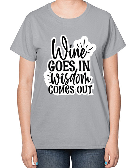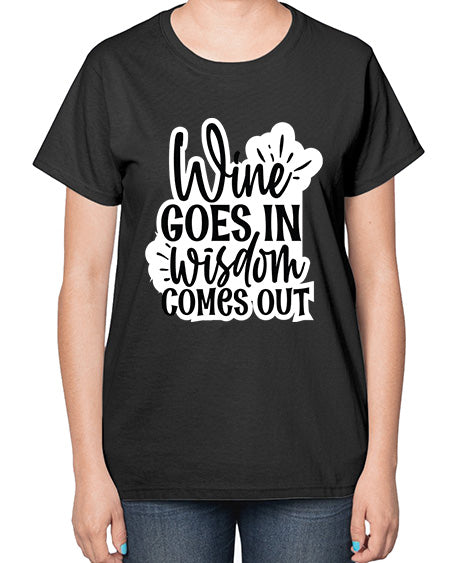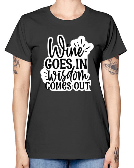 wine goes in wisdom comes out 1250# - funny- Ladies T-Shirt