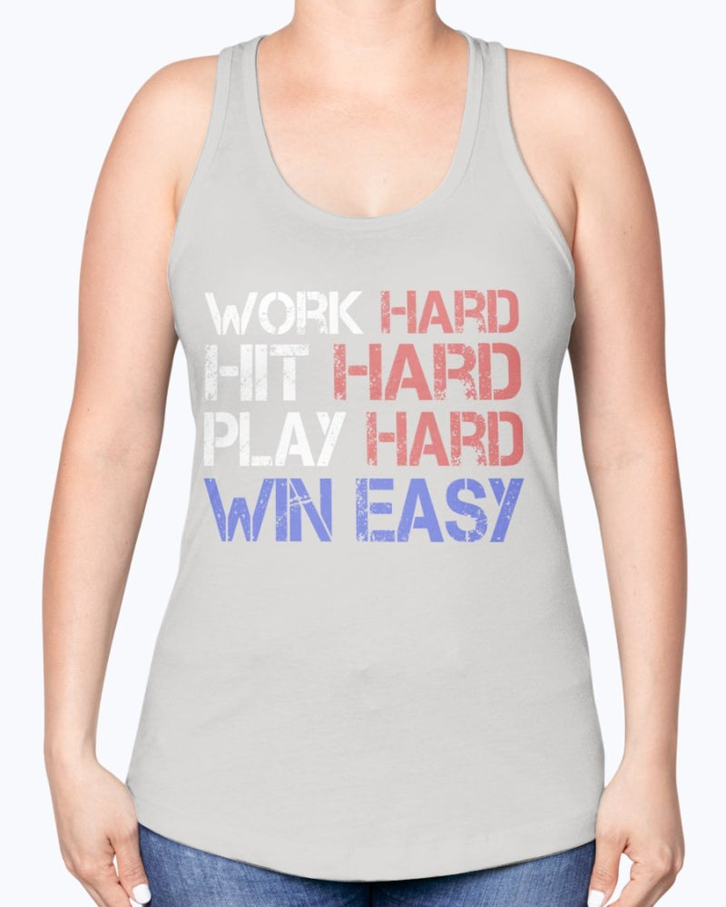 Work, Hit, Play hard, win easy - Sports- Racerback Tank
