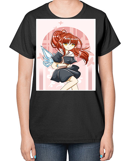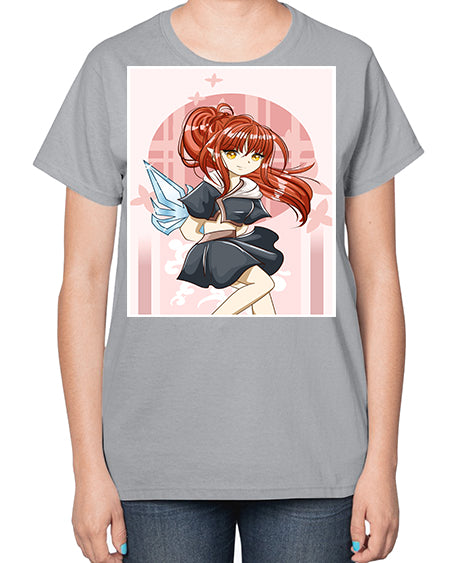Cute and beautiful girl red long hair with sword cartoon 157# - anime- Ladies T-Shirt