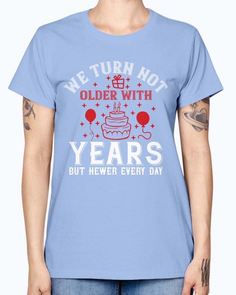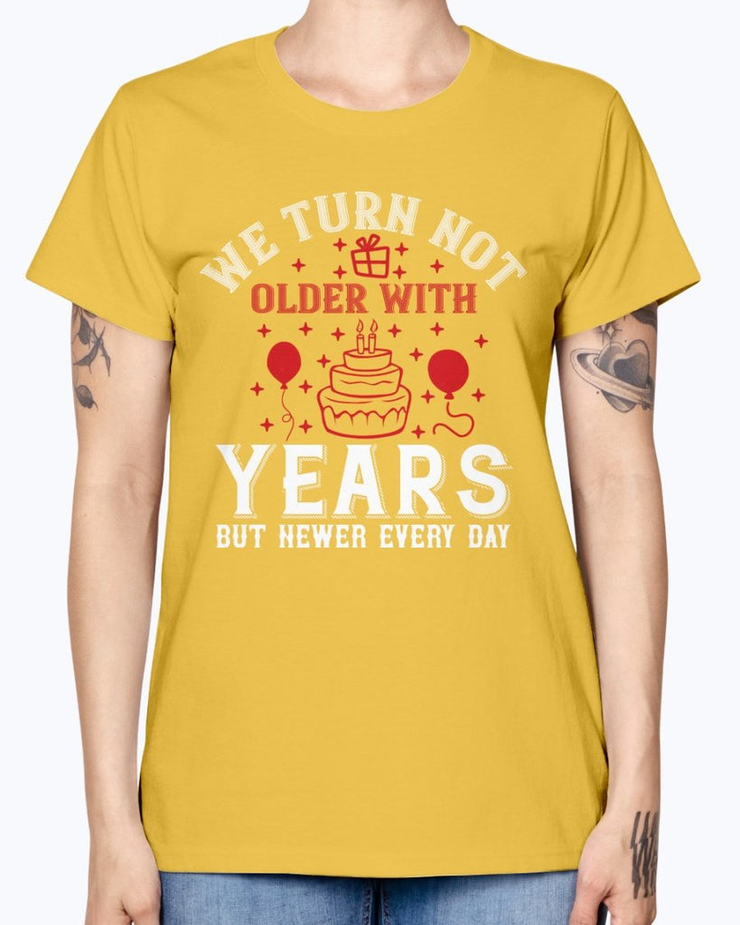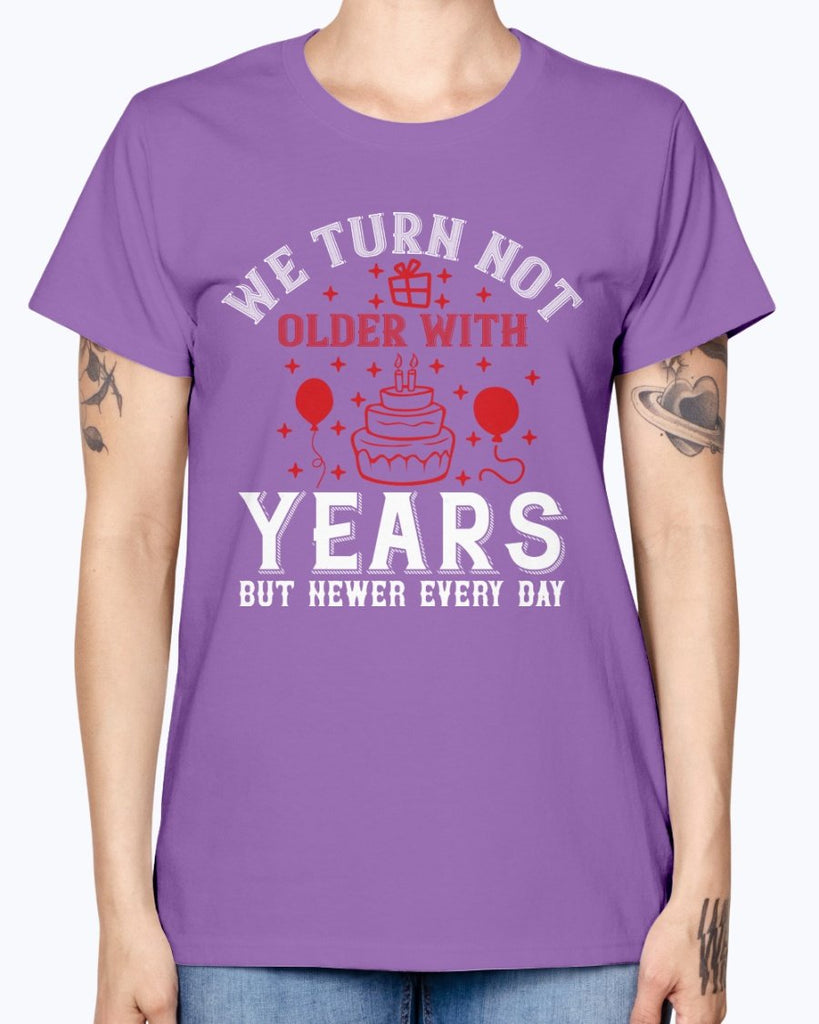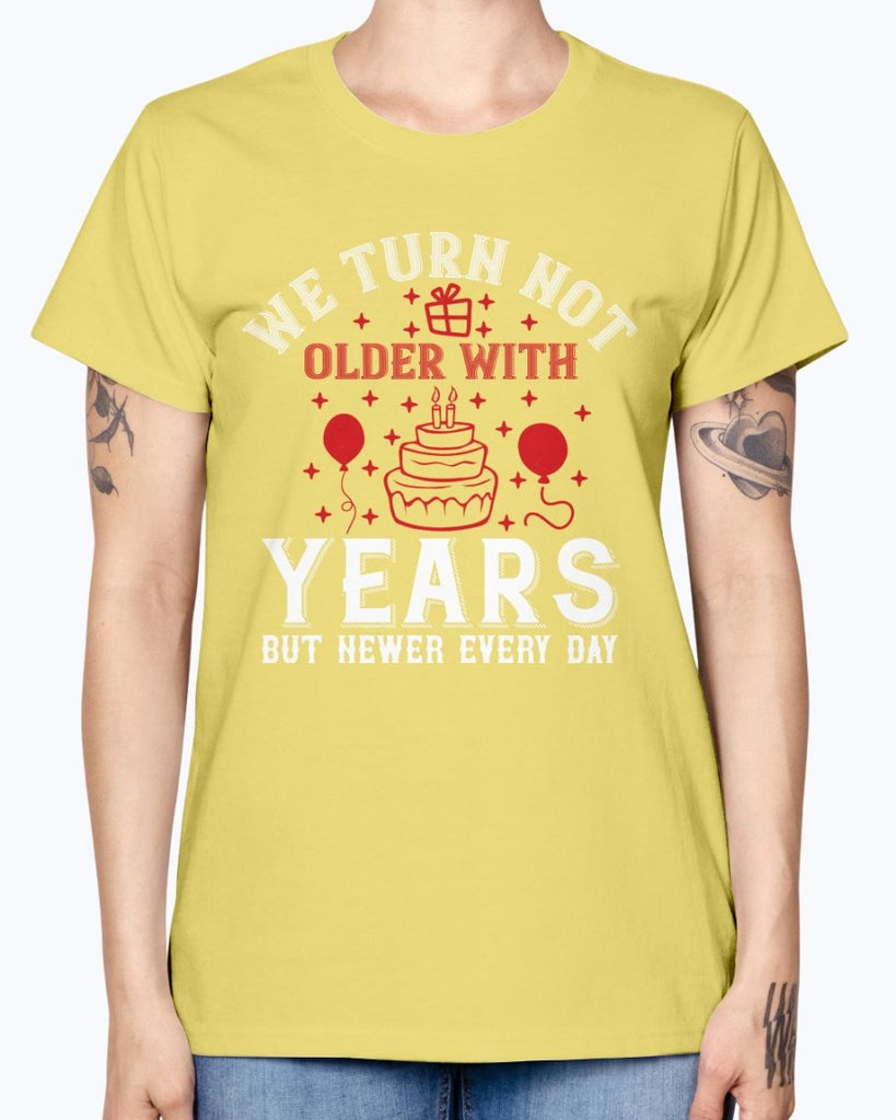 We turn not older with years, but newer every day- Birthday - Missy T-Shirt Note: There is a 2 - 4 day creation time, which may delay shipping. - 100% preshrunk cotton