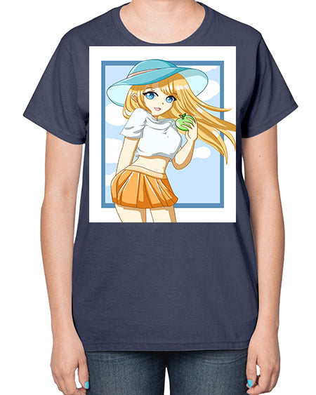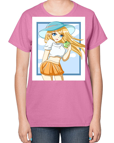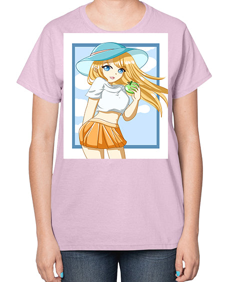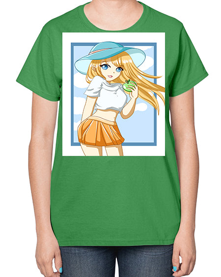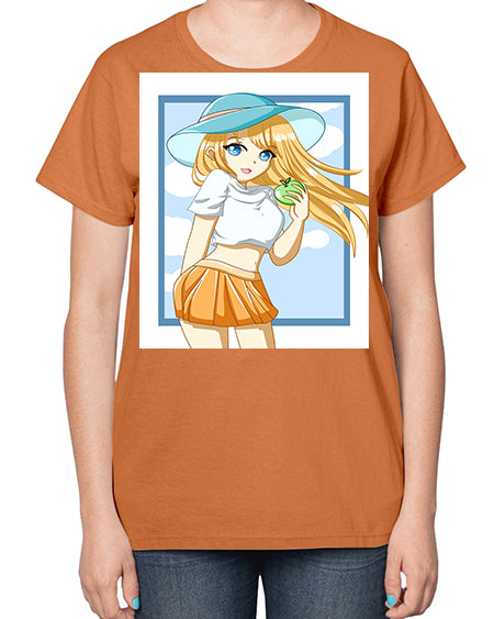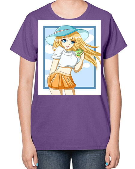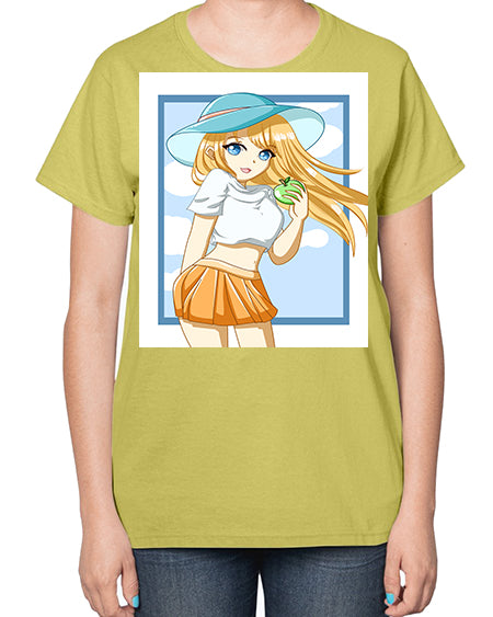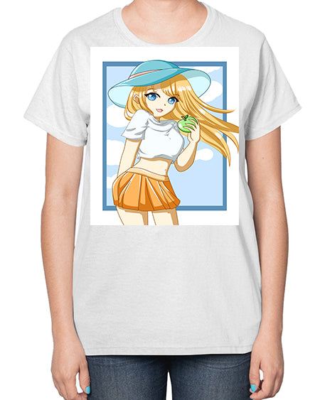 Cute and beautiful girl yellow hair with apple in the summer 158# - anime- Ladies T-Shirt