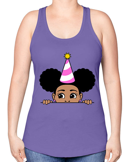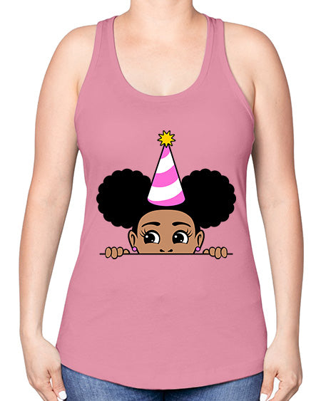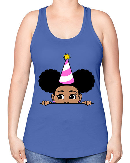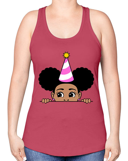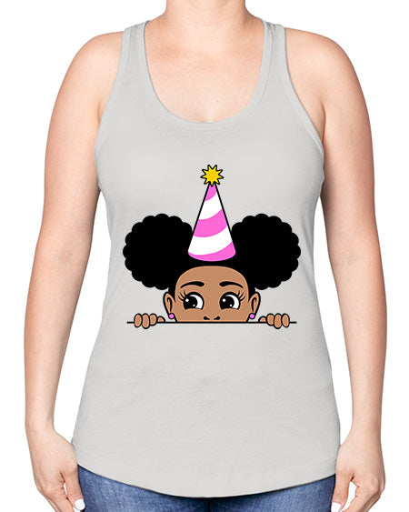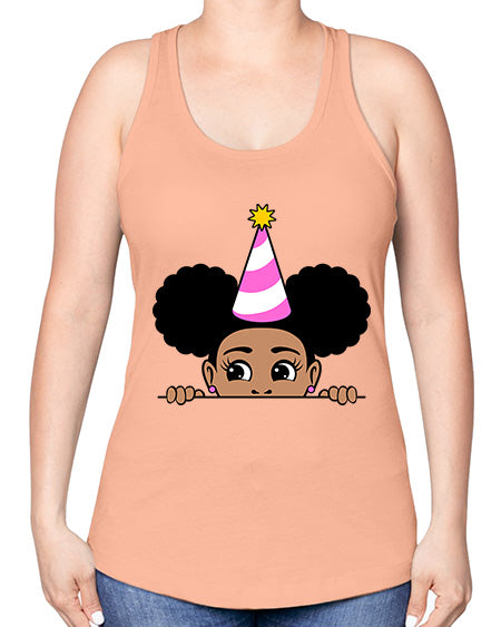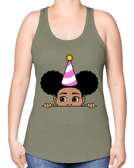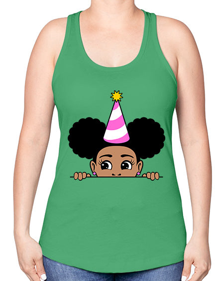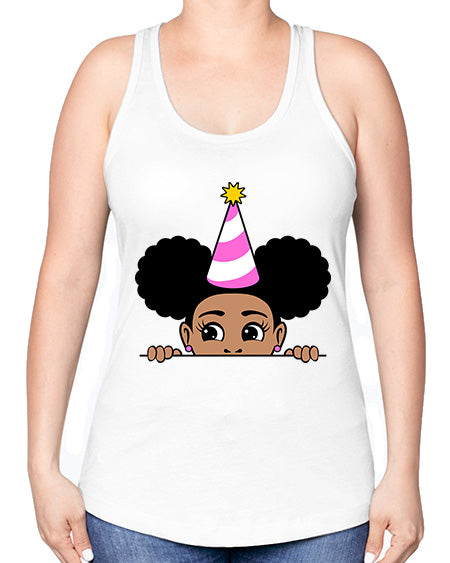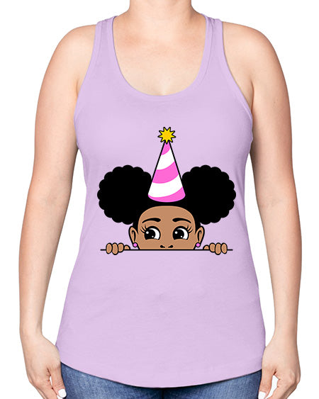 peekaboo afro puffs birthday girl 24# - black girls or women -Racerback Tank