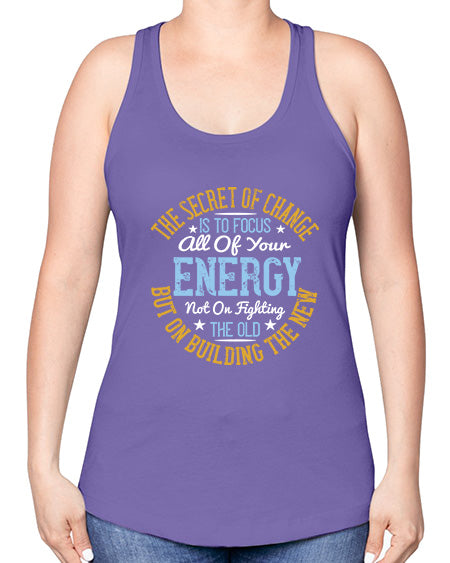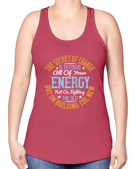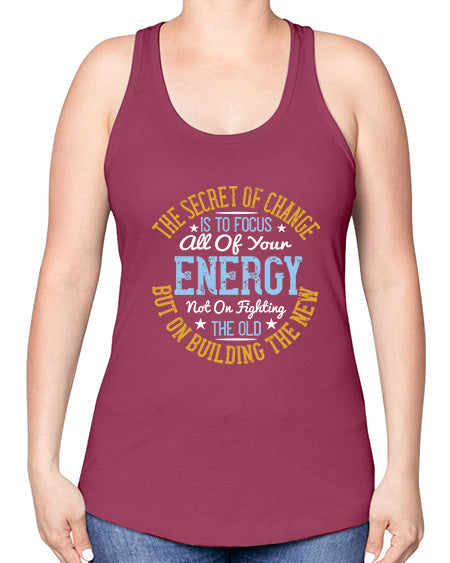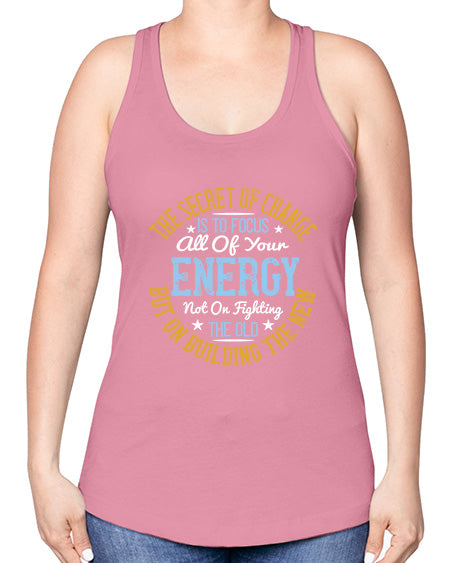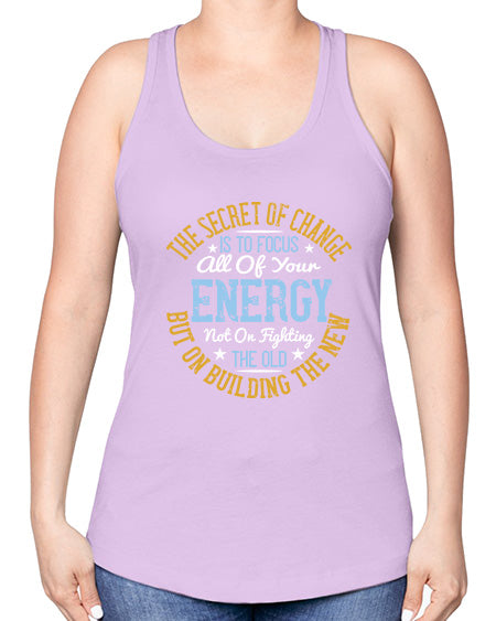 the secret of change is to focus all of your energy not on fighting the old but on building the new 561#- yoga -Racerback Tank