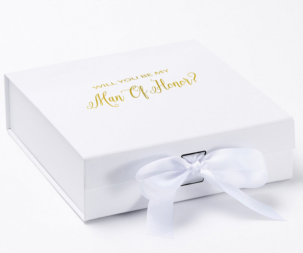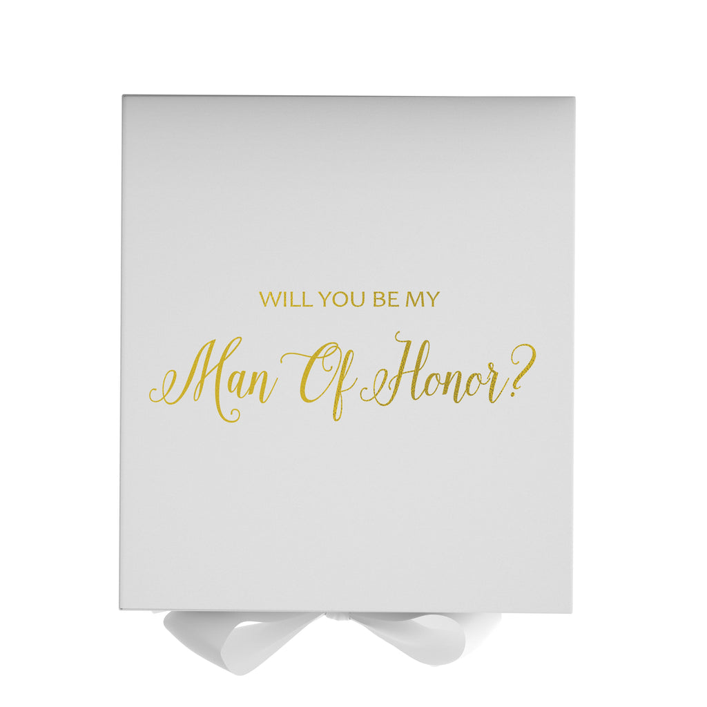 Will you be my Man of Honor, gift box only, metallic writing on lid of box, white box, with White Bow. - No Border