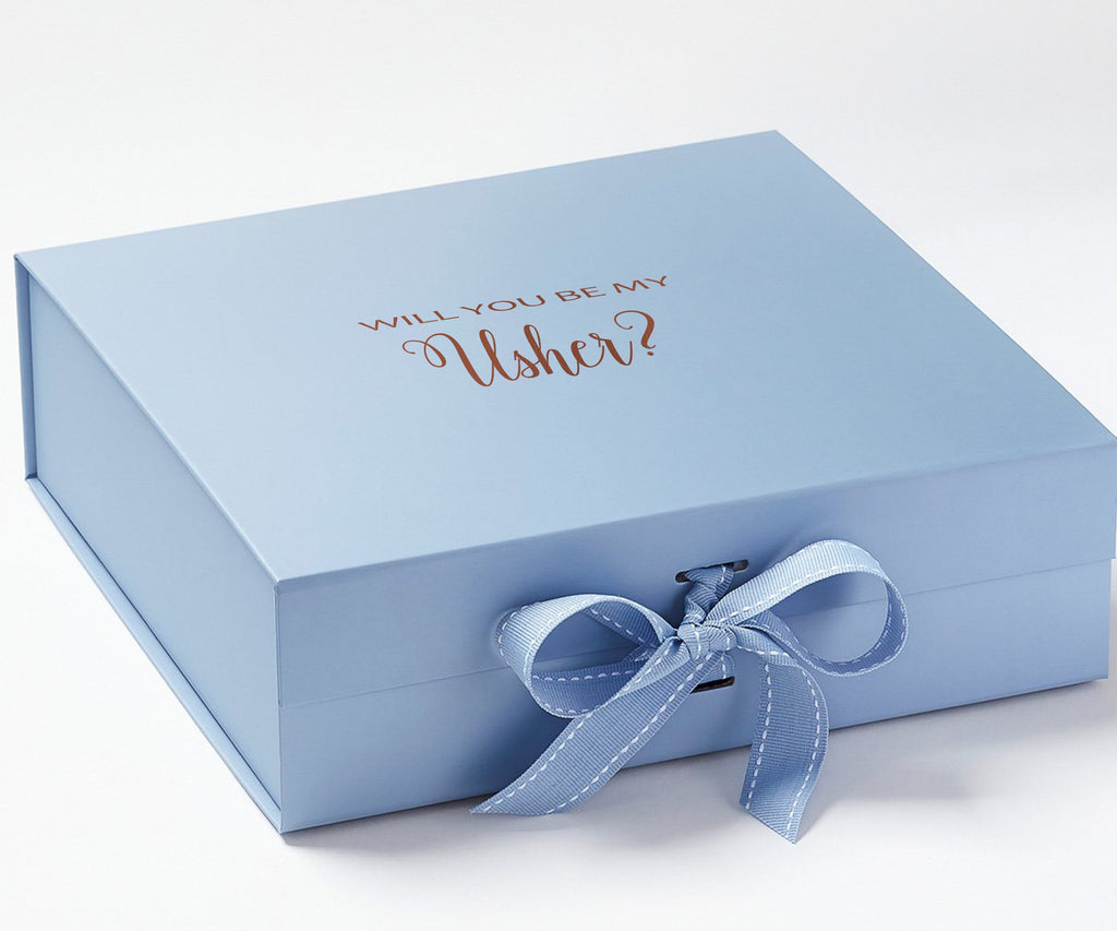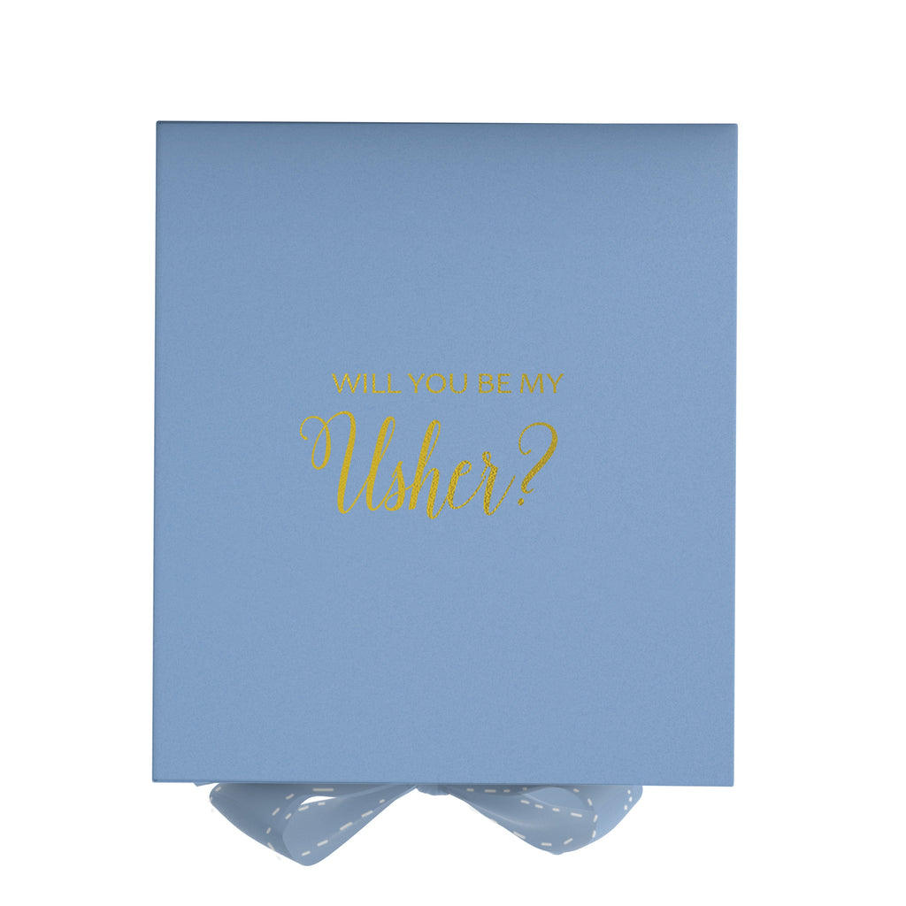 Will you be my Usher, gift box only, metallic writing on lid of box, Light Blue box, with Light Blue Bow. - No Border